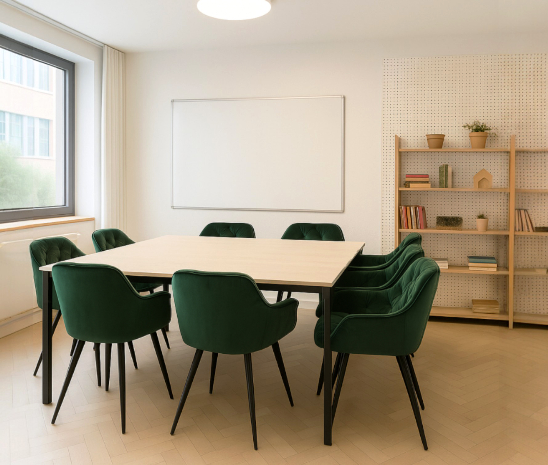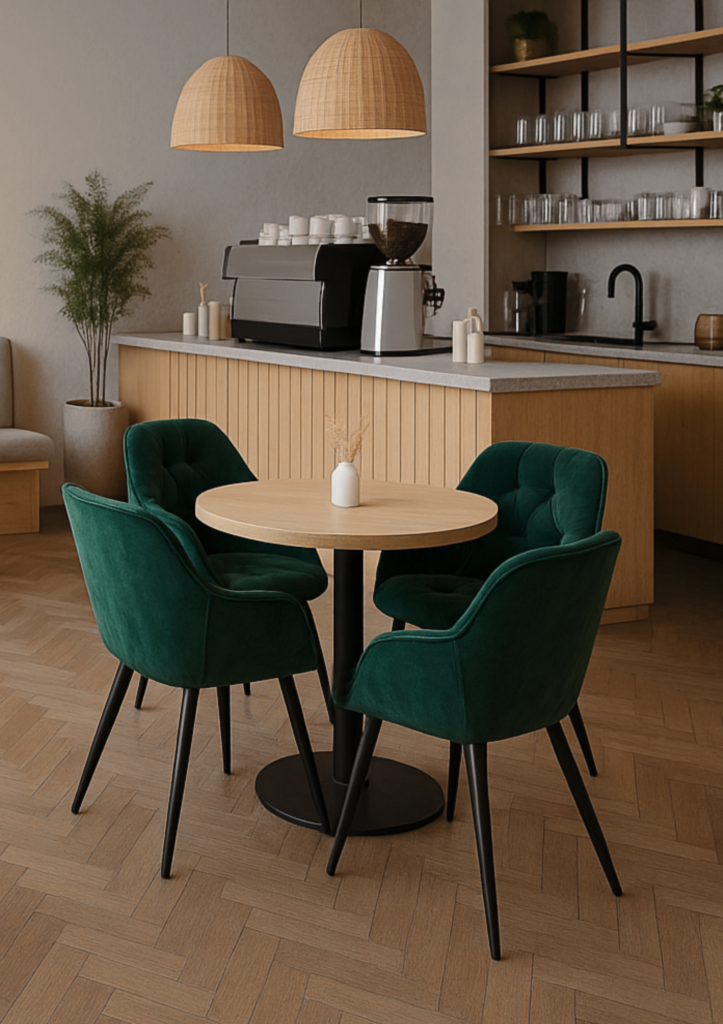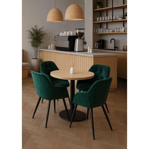 Сдержанный силуэт, выразительная текстура велюра и черные металлические ножки придают интерьеру ощущение изящества и гармонии. Комплект идеально подходит для кухни, столовой, кафе или гостиной, создавая целостную и стильную атмосферу.