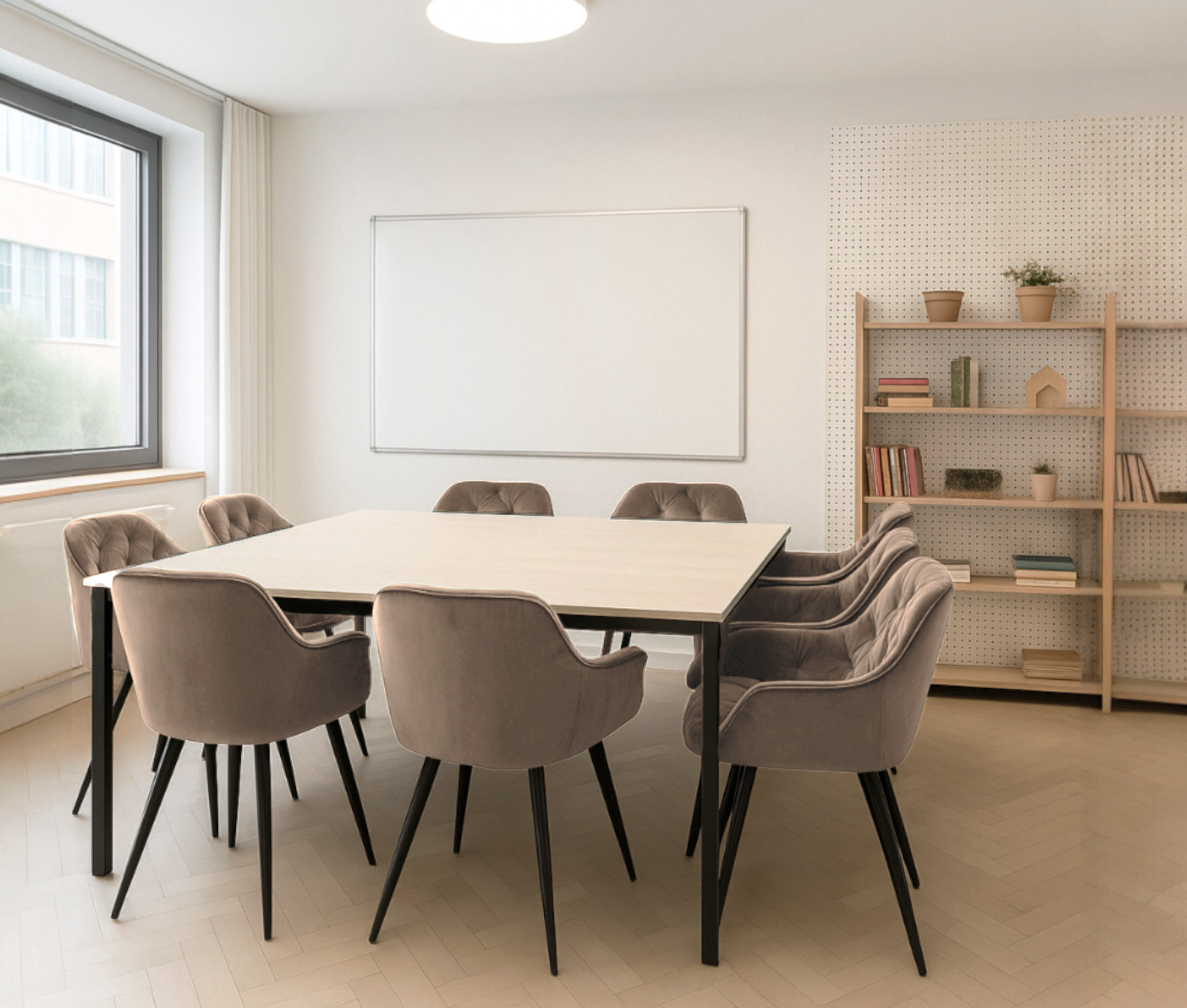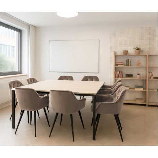 Сдержанный силуэт, выразительная текстура велюра и черные металлические ножки придают интерьеру ощущение изящества и гармонии. Комплект идеально подходит для кухни, столовой, кафе или гостиной, создавая целостную и стильную атмосферу.