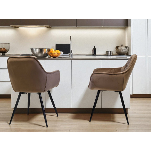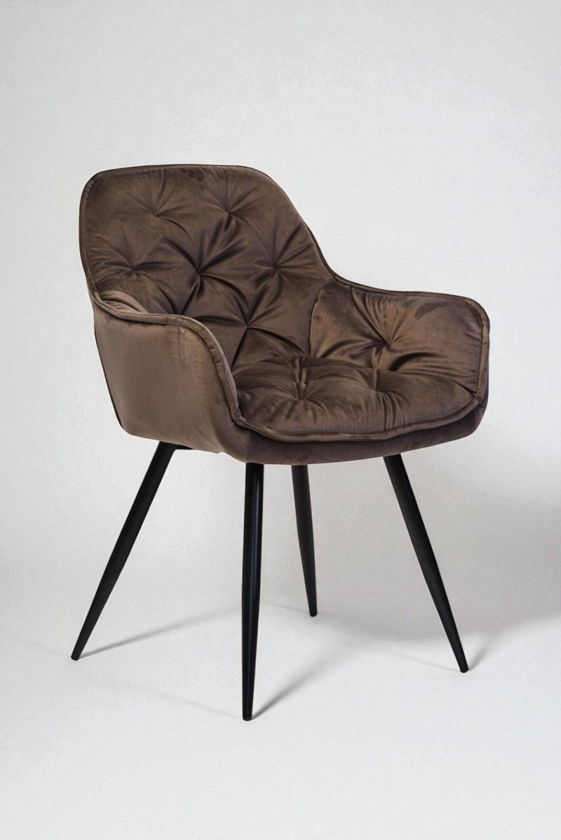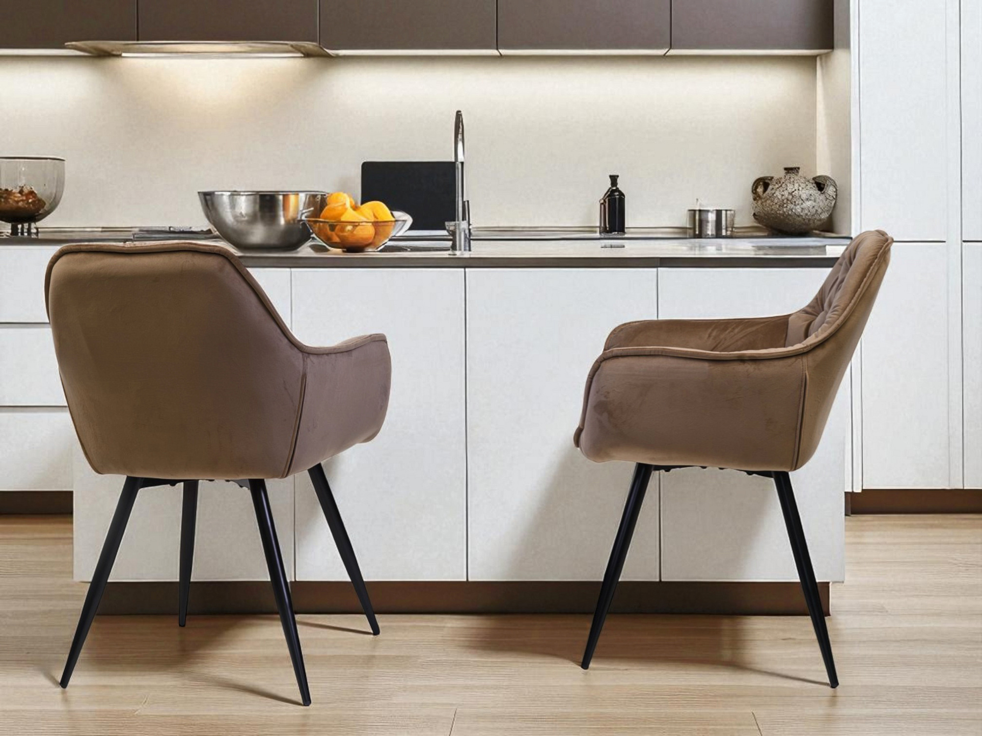 Сдержанный силуэт, выразительная текстура велюра и черные металлические ножки придают интерьеру ощущение изящества и гармонии. Комплект идеально подходит для кухни, столовой, кафе или гостиной, создавая целостную и стильную атмосферу.