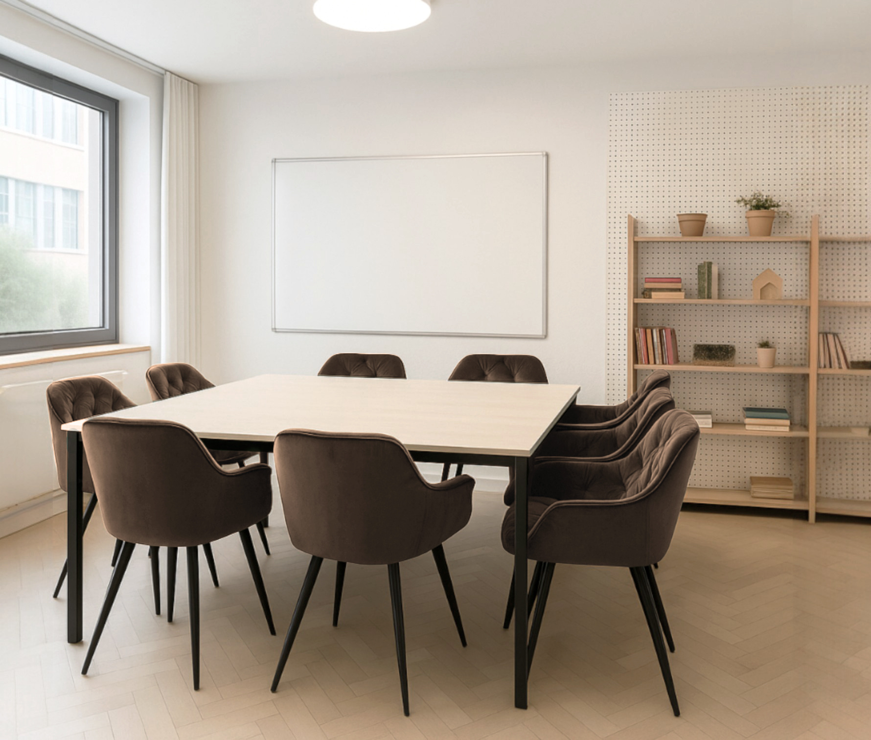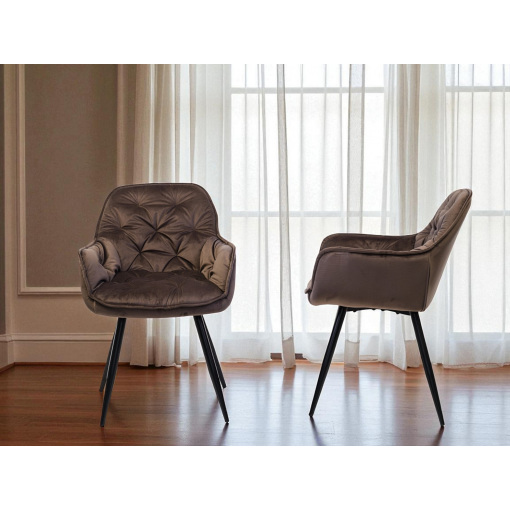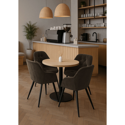 Сдержанный силуэт, выразительная текстура велюра и черные металлические ножки придают интерьеру ощущение изящества и гармонии. Комплект идеально подходит для кухни, столовой, кафе или гостиной, создавая целостную и стильную атмосферу.
