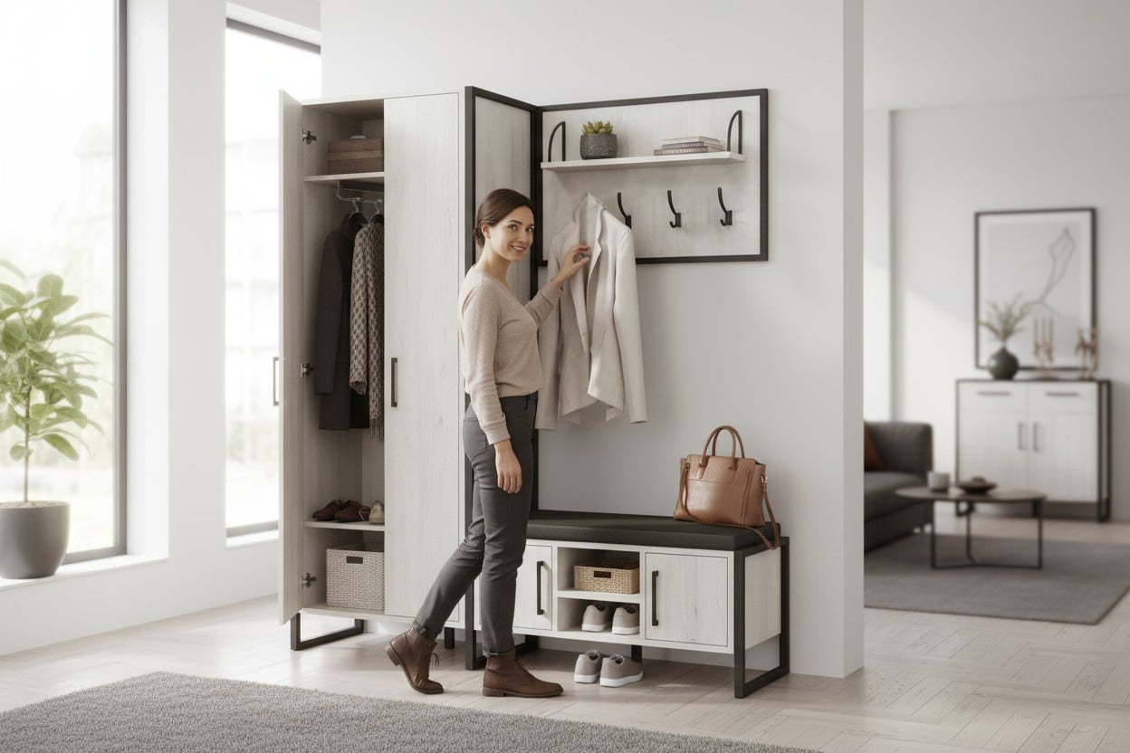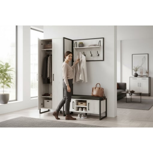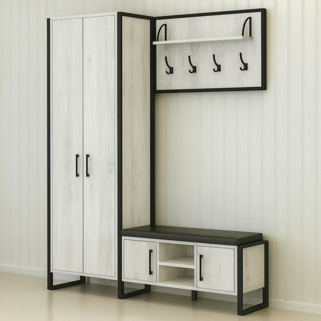 Прихожая в стиле лофт — это современный комплект мебели, созданный для удобного и стильного обустройства Вашего коридора. Сочетание теплой древесной текстуры и черного металлического каркаса делает такую прихожую выразительным акцентом интерьера, а продуманная функциональность обеспечивает комфорт в ежедневном использовании.