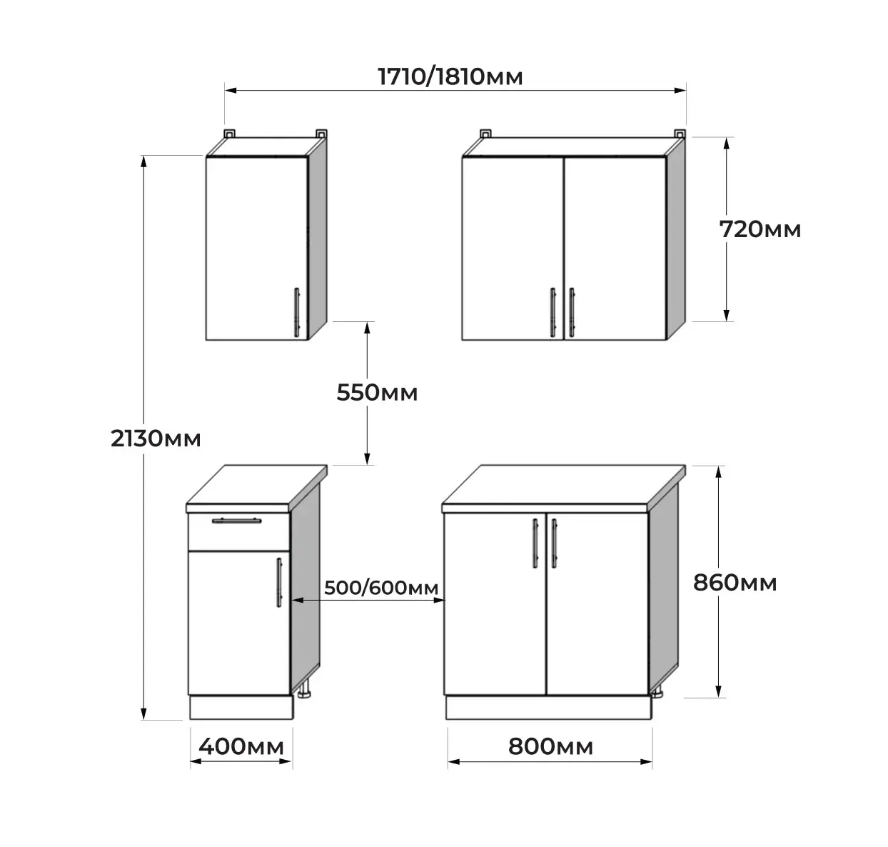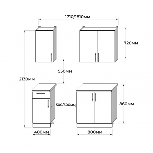 Общие размеры набора учитывают размер газовой плиты 500/600 мм и вытяжки 500/600 мм.