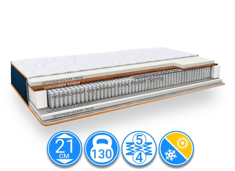 Между пружинным блоком и мягкими слоями матраса расположено термоволокно Extra Felt, которое выполняет двойной уровень защиты и продлевает сроки использования изделия.