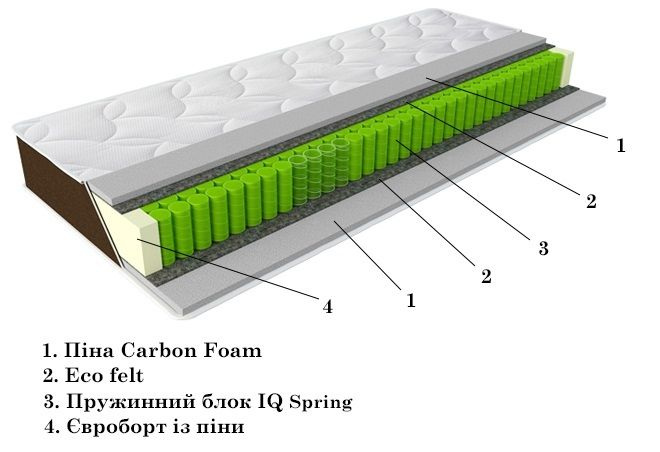 Данная модель изготовлена с использованием пружинного блока IQ Spring, в котором каждая пружина подстраивается под вес человека. Особенностью пружин является то, что они имеют форму песочных часов (узкая талия, широкое основание), благодаря чему в них сосредоточено несколько уровней жесткости. Изделие имеет длительный срок эксплуатации.