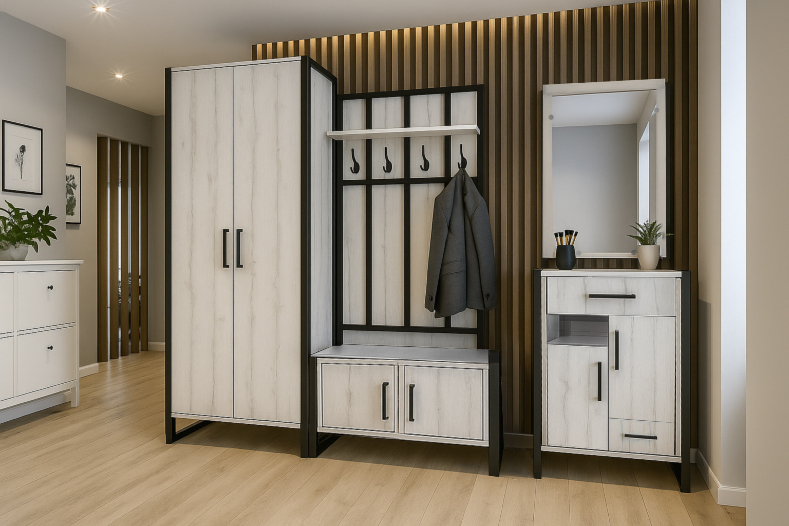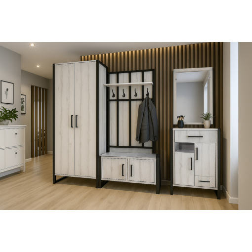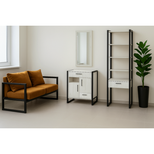 Функциональная конструкция позволяет удобно хранить вещи и аксессуары, поддерживая порядок в ежедневном использовании. Тумба для прихожей в стиле лофт подходит как для небольших, так и для просторных коридоров и легко сочетается с другой мебелью для прихожей.