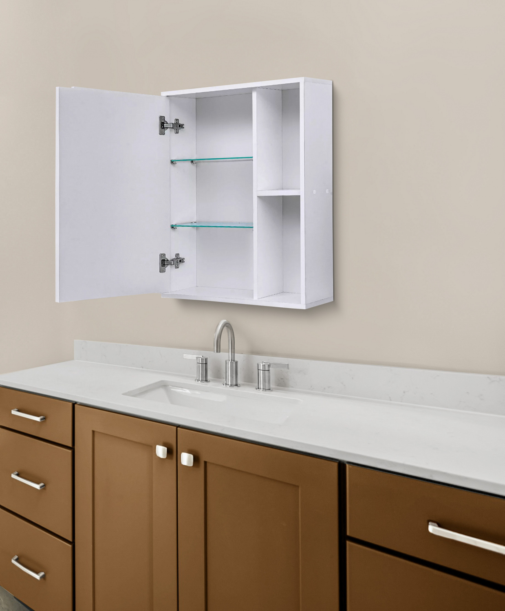 Внутри шкафа расположены стеклянные полки толщиной 4 мм. Открытые боковые