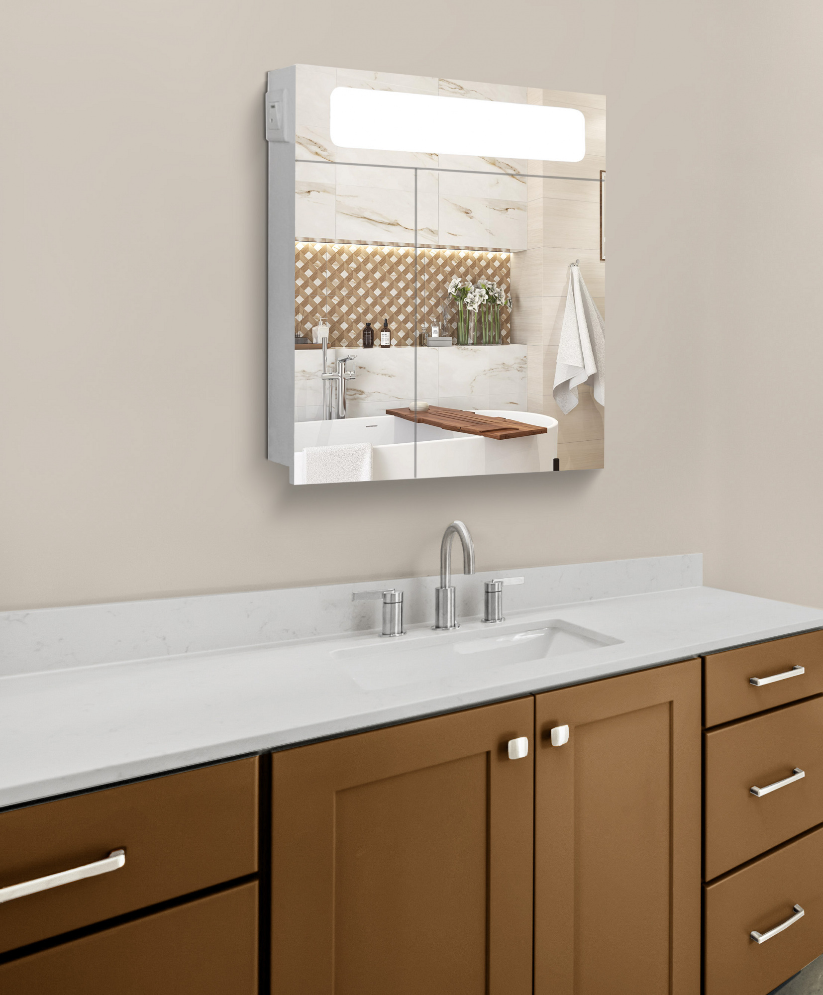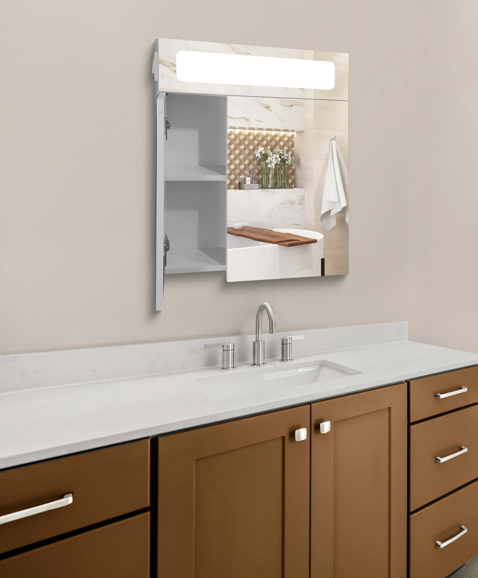 Встроенное освещение создаёт в ванной комнате приятную и расслабляющую атмосферу, что немаловажно после тяжёлого дня.
