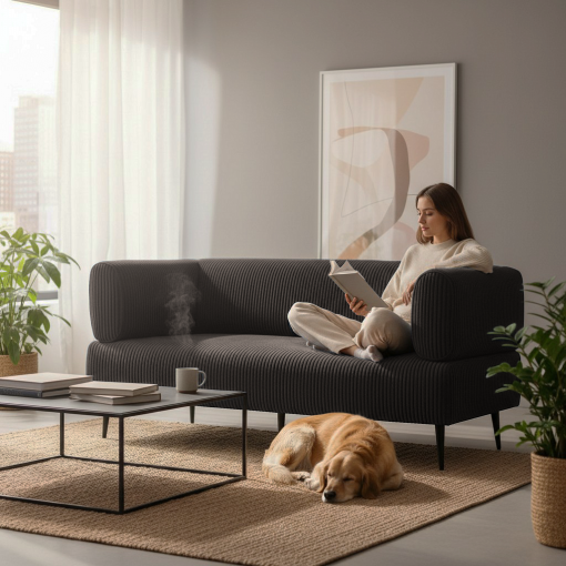 • М’які підлокітники роблять посадку ще зручнішою, а приємна на дотик велюрова оббивка з елементами вельвету та властивістю антикіготь поєднує естетику і практичність.