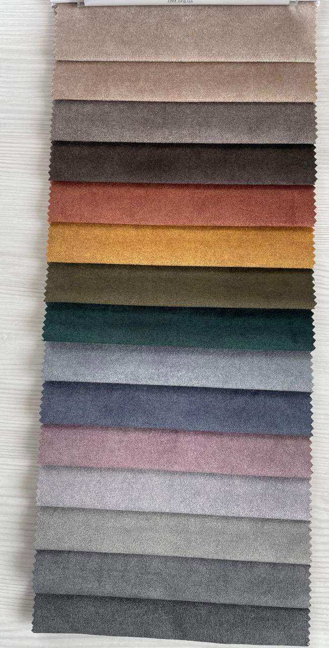 Оббивка: м’який на дотик та стійкий до плям велюр зі зносостійкістю 50 000 циклів. Тканина легко чиститься та має властивість антикіготь.