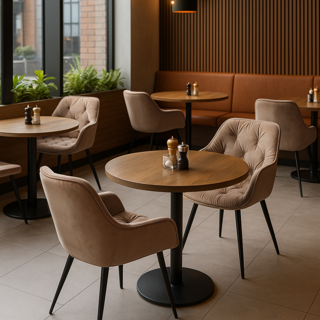 Сдержанный силуэт, выразительная текстура велюра и черные металлические ножки придают интерьеру ощущение изящества и гармонии. Комплект идеально подходит для кухни, столовой, кафе или гостиной, создавая целостную и стильную атмосферу.