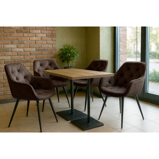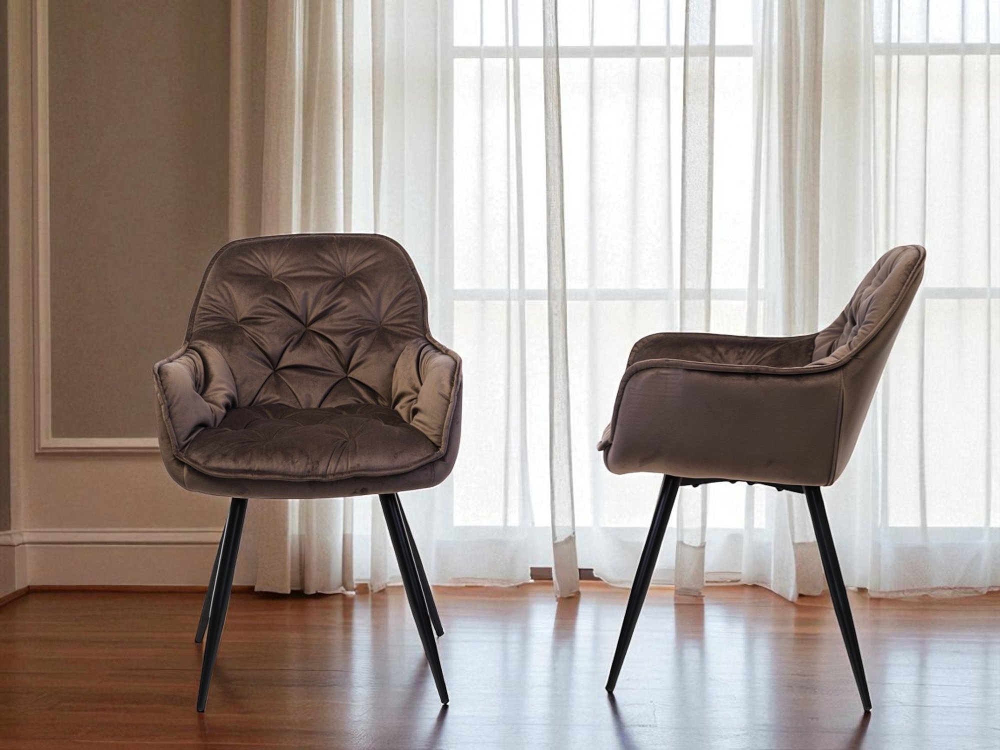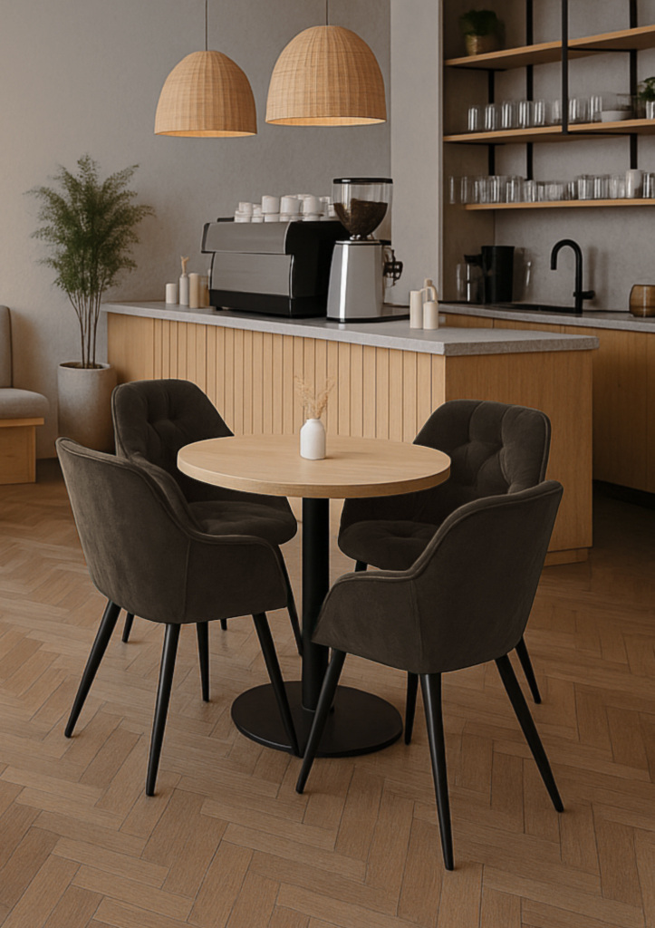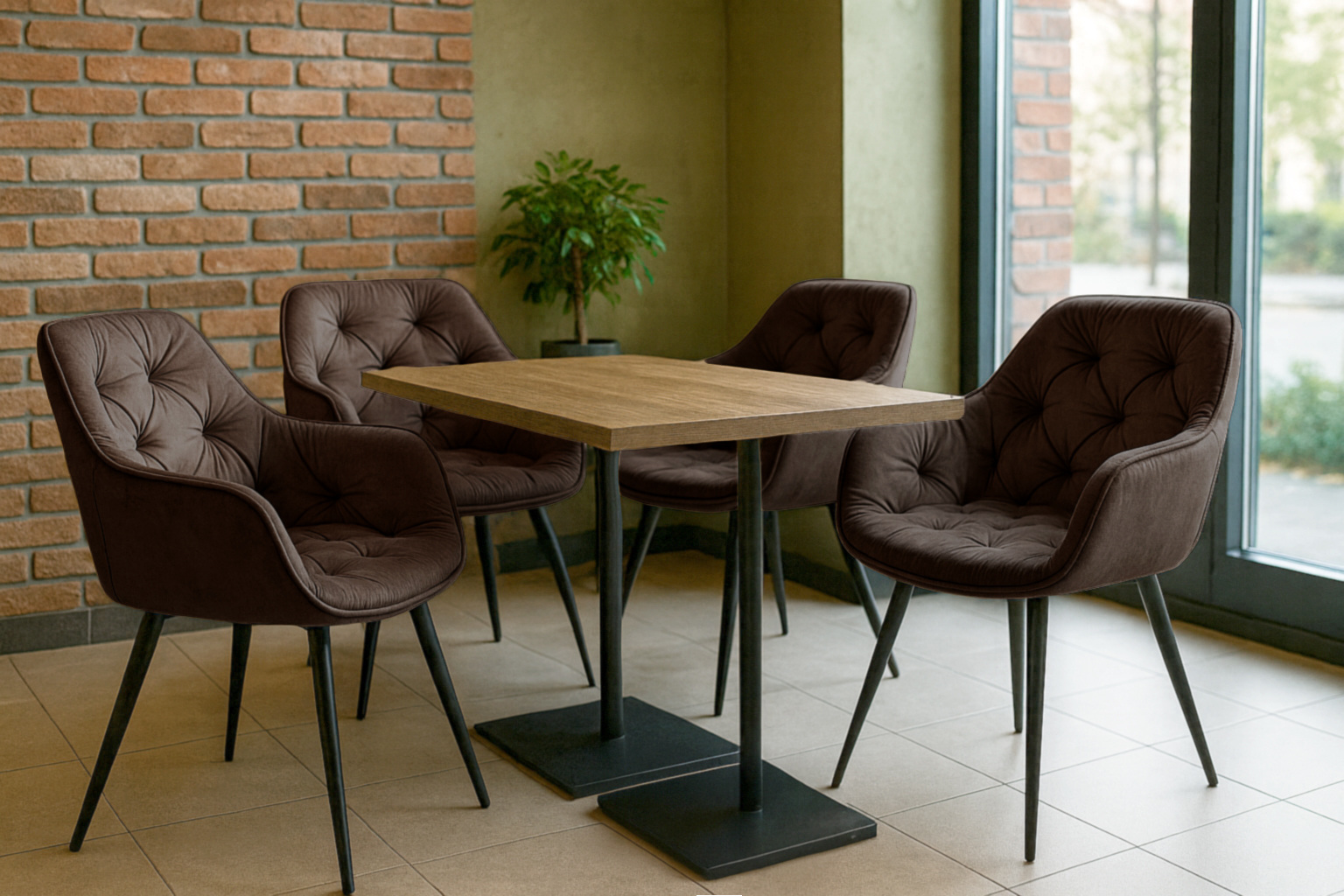 Сдержанный силуэт, выразительная текстура велюра и черные металлические ножки придают интерьеру ощущение изящества и гармонии. Комплект идеально подходит для кухни, столовой, кафе или гостиной, создавая целостную и стильную атмосферу.