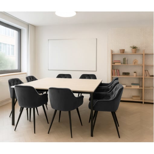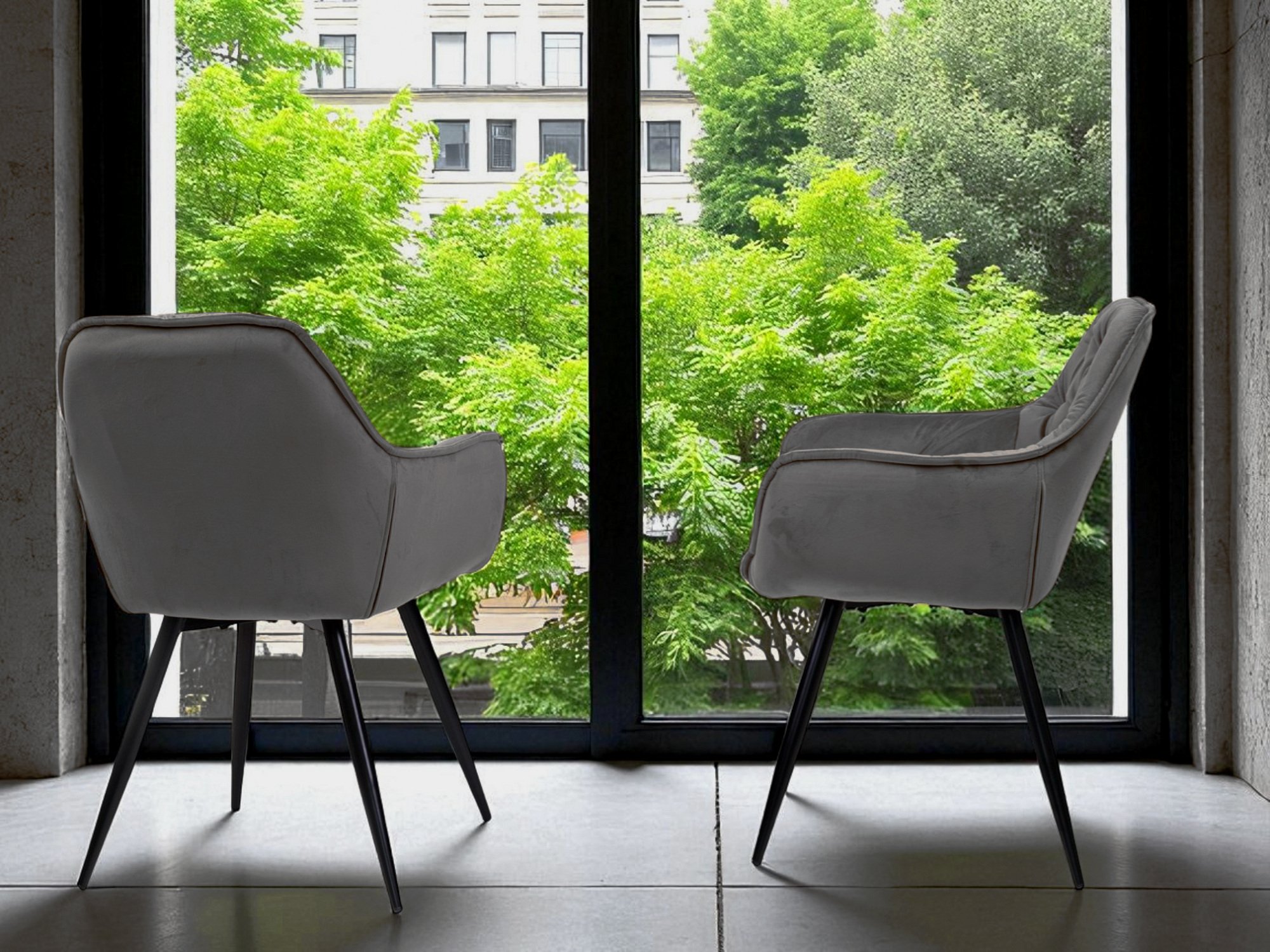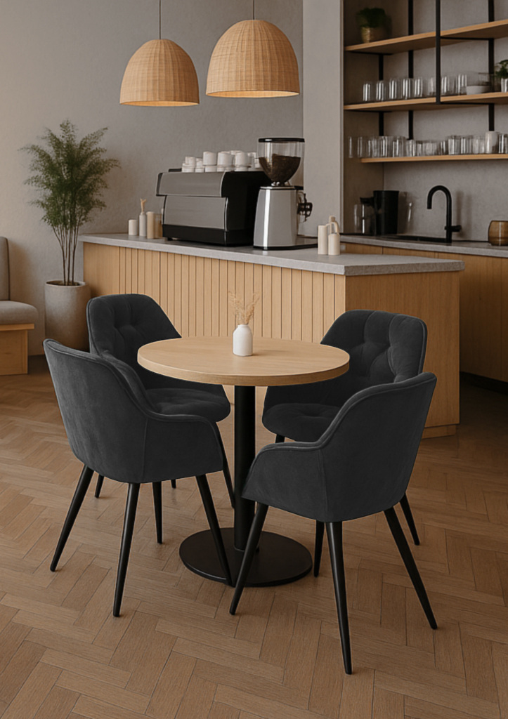 Сдержанный силуэт, выразительная текстура велюра и черные металлические ножки придают интерьеру ощущение изящества и гармонии. Комплект идеально подходит для кухни, столовой, кафе или гостиной, создавая целостную и стильную атмосферу.