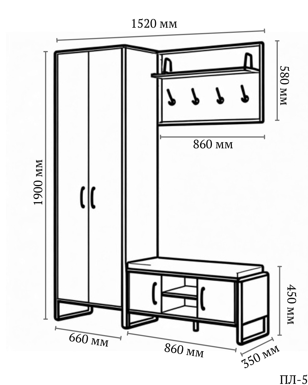 • Максимальна місткість — шафа, тумба, полиці та гачки для одягу