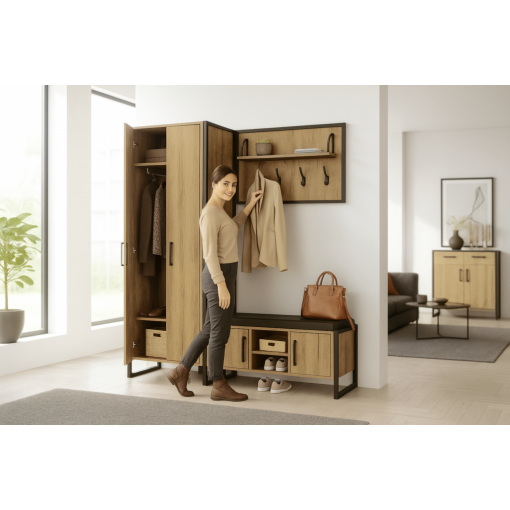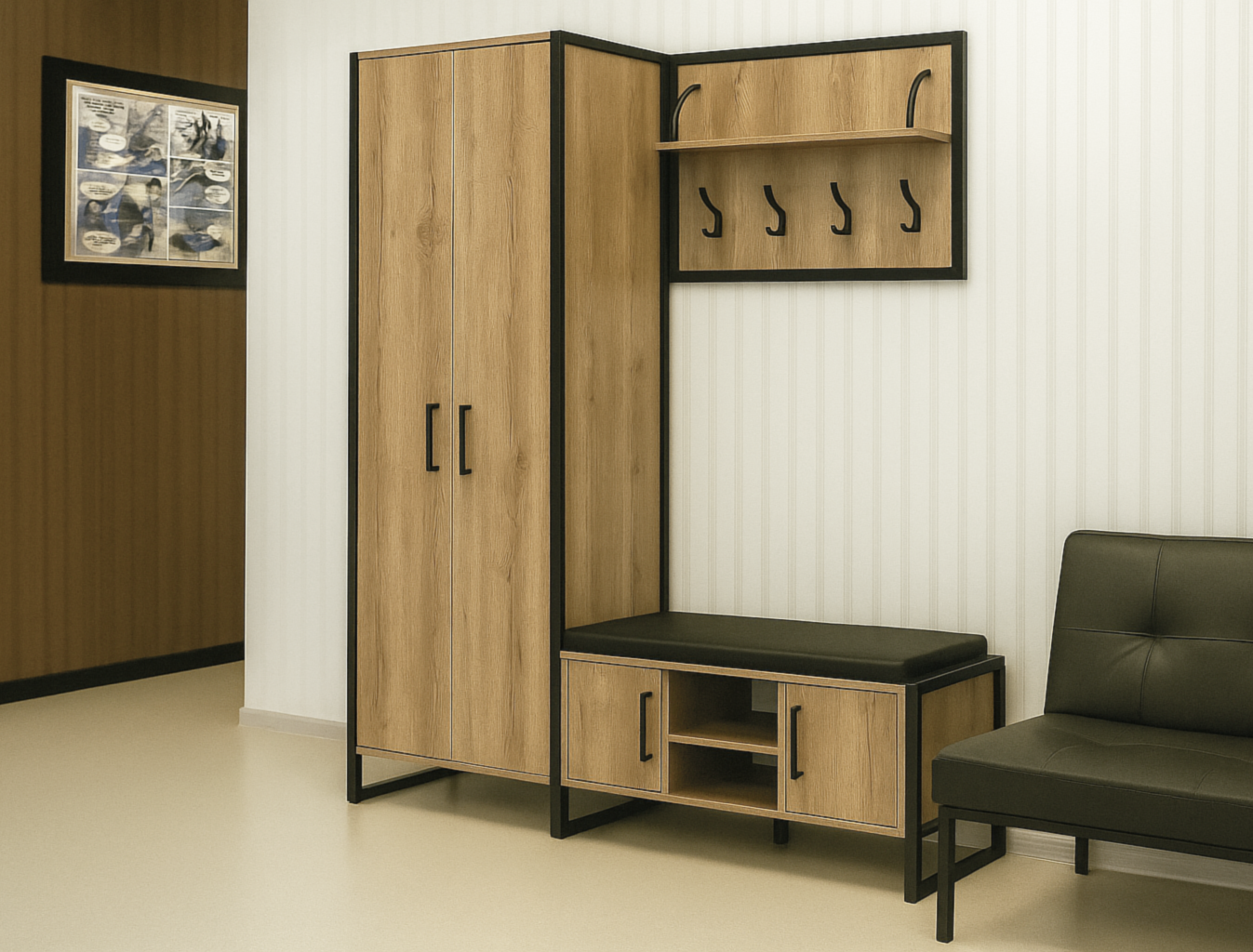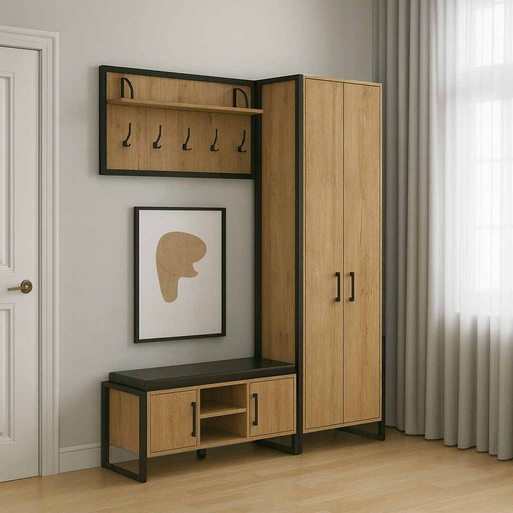 Передпокій у стилі лофт — це сучасний комплект меблів, створений для зручного та стильного облаштування Вашого коридору. Поєднання теплої деревної текстури та чорного металевого каркаса робить такий передпокій виразним акцентом інтер’єру, а продумана функціональність забезпечує комфорт у щоденному користуванні.