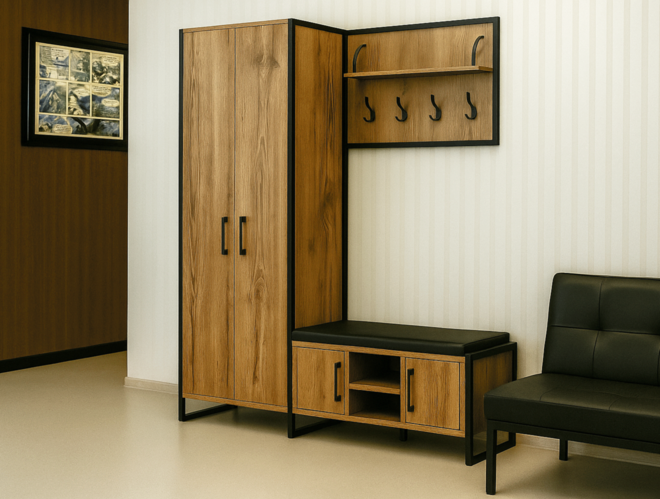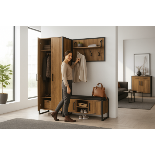 Передпокій у стилі лофт — це сучасний комплект меблів, створений для зручного та стильного облаштування Вашого коридору. Поєднання теплої деревної текстури та чорного металевого каркаса робить такий передпокій виразним акцентом інтер’єру, а продумана функціональність забезпечує комфорт у щоденному користуванні.