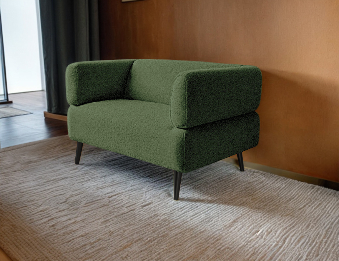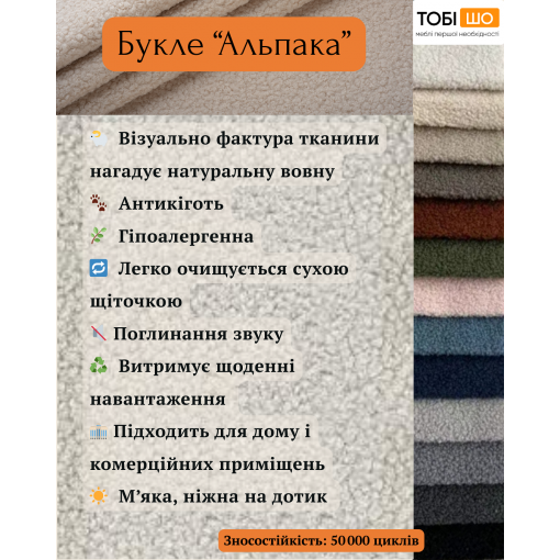 Оббивка виготовлена з м'якого та приємного на дотик букле Альпака зі зносостійкістю 50 000 циклів. Тканина вирізняється практичністю, довговічністю та екологічністю. Її натуральний склад не провокує алергічних реакцій, що робить цей матеріал ідеальним вибором для людей із чутливою шкірою.