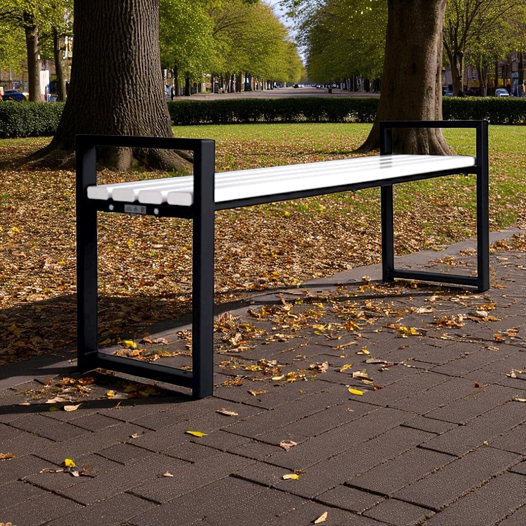 Лавка «Модерн» без спинки з підлокітниками - ідеальна для саду, дачі чи громадського простору. Сидіння з високоякісного ПВХ стійке до сонця, вологи та не потребує догляду. Металевий каркас гарантує міцність і довговічність, порошкове фарбування захищає від корозії.
