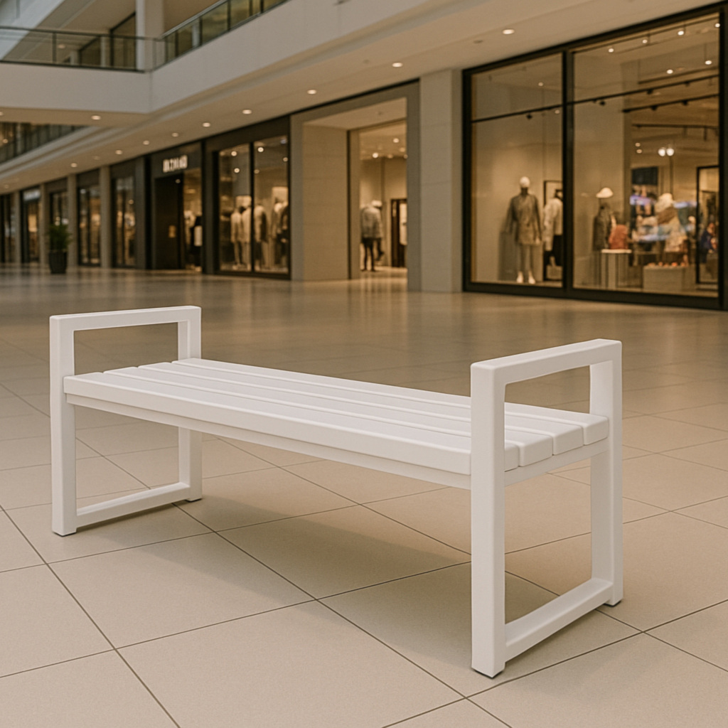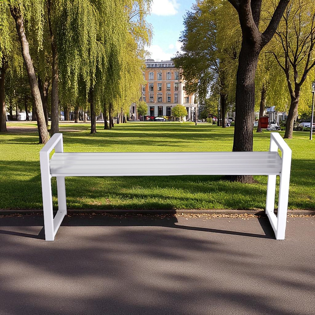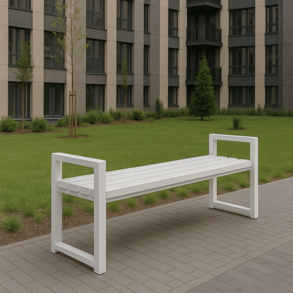 Лавка «Модерн» без спинки з підлокітниками - ідеальна для саду, дачі чи громадського простору. Сидіння з високоякісного ПВХ стійке до сонця, вологи та не потребує догляду. Металевий каркас гарантує міцність і довговічність, порошкове фарбування захищає від корозії.