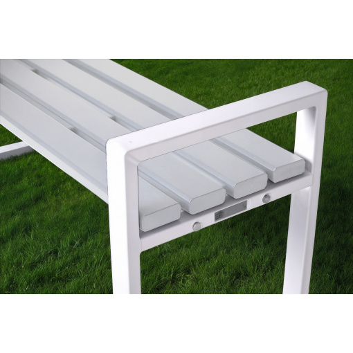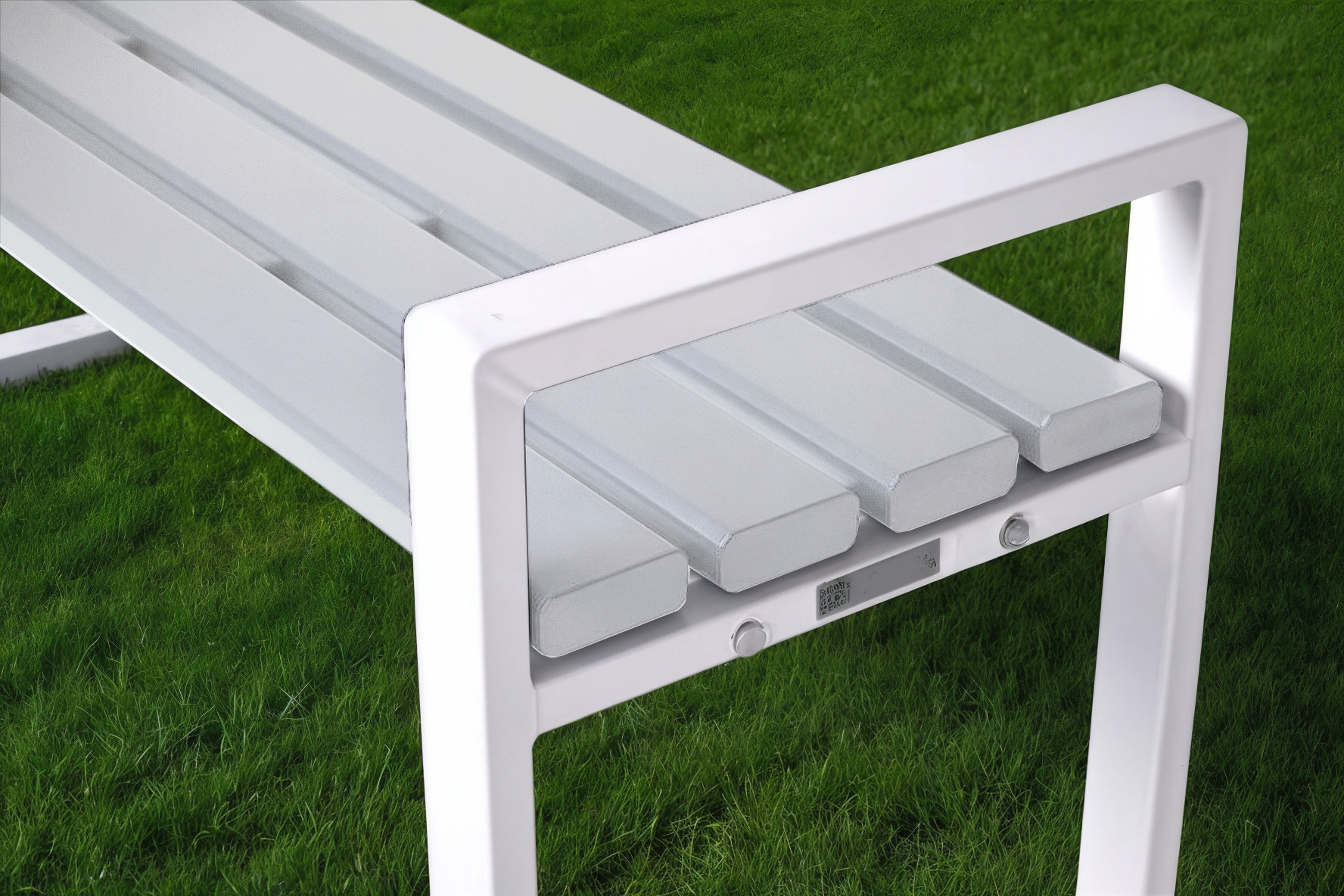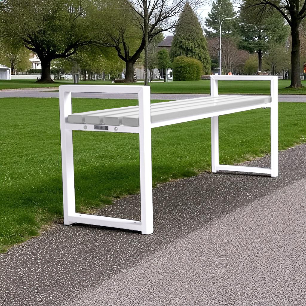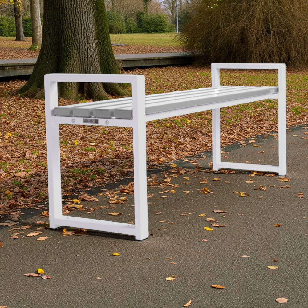 Лавка «Модерн» без спинки з підлокітниками - ідеальна для саду, дачі чи громадського простору. Сидіння з високоякісного ПВХ стійке до сонця, вологи та не потребує догляду. Металевий каркас гарантує міцність і довговічність, порошкове фарбування захищає від корозії.