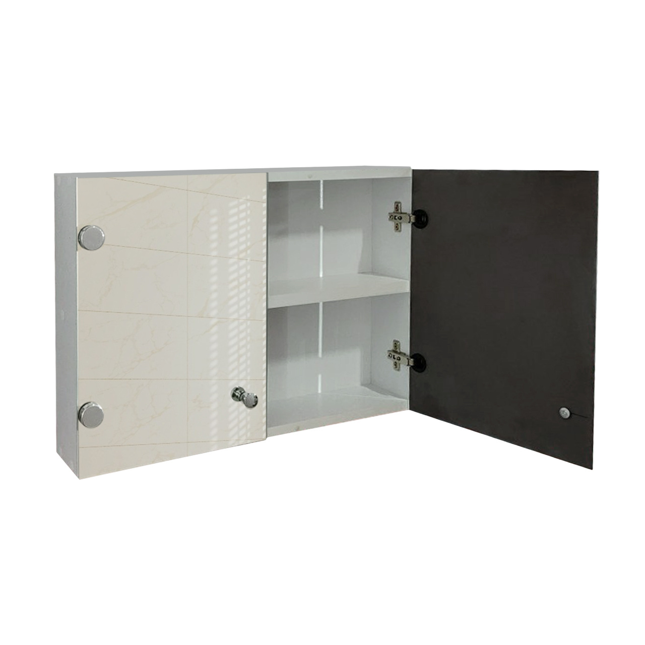 Фасад виготовлений із вологостійкого дзеркального полотна. Петлі та ручки врізані в саме полотно.