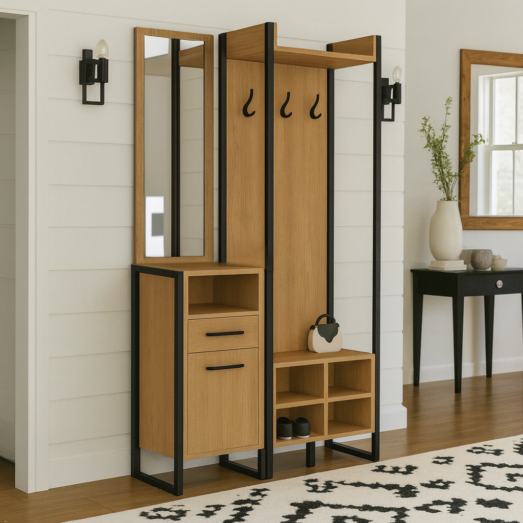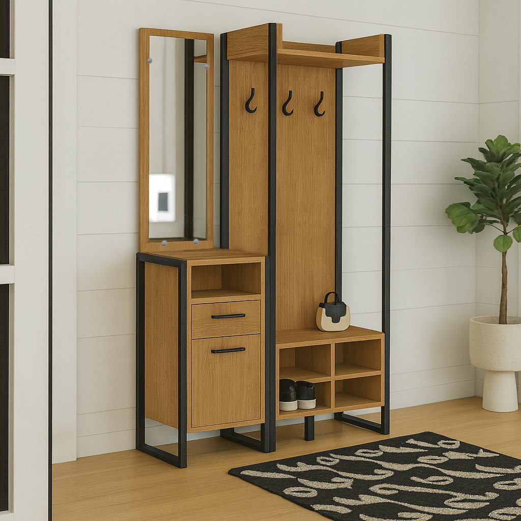 Передпокій у стилі лофт — це сучасний комплект меблів, створений для зручного та стильного облаштування Вашого коридору. Поєднання теплої деревної текстури та чорного металевого каркаса робить такий передпокій виразним акцентом інтер’єру, а продумана функціональність забезпечує комфорт у щоденному користуванні.