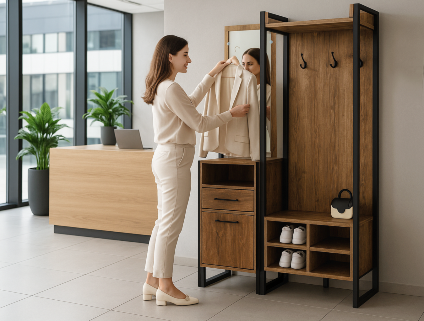 Модульна конструкція дозволяє розмістити всі необхідні речі: верхній одяг, взуття, аксесуари та дрібниці, які завжди мають бути під рукою.