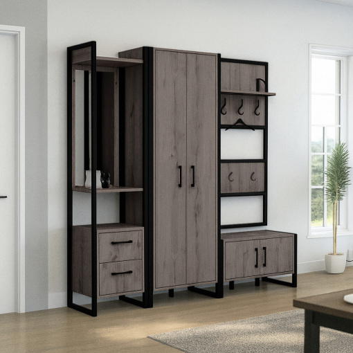 Передпокій у стилі лофт — це сучасний комплект меблів, створений для зручного та стильного облаштування Вашого коридору. Поєднання теплої деревної текстури та чорного металевого каркаса робить такий передпокій виразним акцентом інтер’єру, а продумана функціональність забезпечує комфорт у щоденному користуванні.