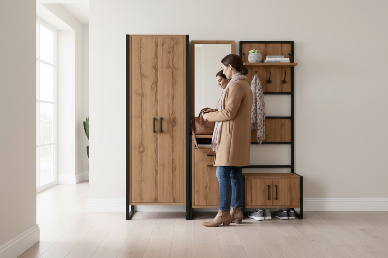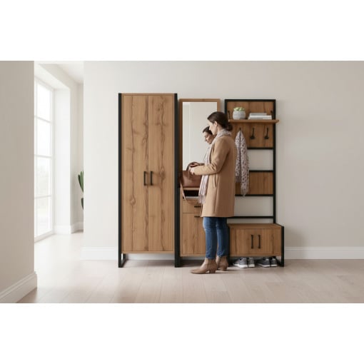 Передпокій у стилі лофт — це сучасний комплект меблів, створений для зручного та стильного облаштування Вашого коридору. Поєднання теплої деревної текстури та чорного металевого каркаса робить такий передпокій виразним акцентом інтер’єру, а продумана функціональність забезпечує комфорт у щоденному користуванні.