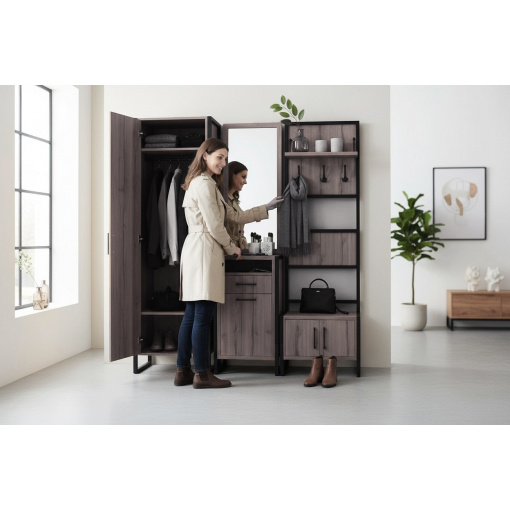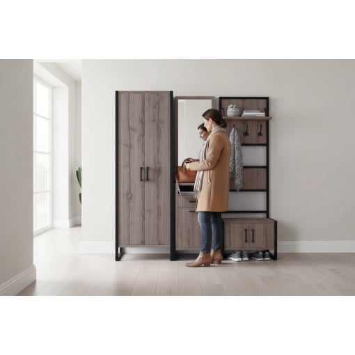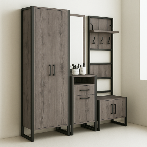 Передпокій у стилі лофт — це сучасний комплект меблів, створений для зручного та стильного облаштування Вашого коридору. Поєднання теплої деревної текстури та чорного металевого каркаса робить такий передпокій виразним акцентом інтер’єру, а продумана функціональність забезпечує комфорт у щоденному користуванні.