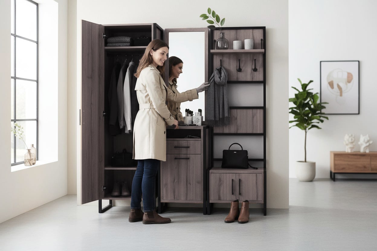 Модульна конструкція дозволяє розмістити всі необхідні речі: верхній одяг, взуття, аксесуари та дрібниці, які завжди мають бути під рукою.