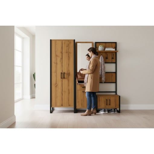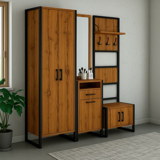 Передпокій у стилі лофт — це сучасний комплект меблів, створений для зручного та стильного облаштування Вашого коридору. Поєднання теплої деревної текстури та чорного металевого каркаса робить такий передпокій виразним акцентом інтер’єру, а продумана функціональність забезпечує комфорт у щоденному користуванні.