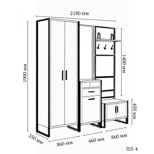 Модульна конструкція дозволяє розмістити всі необхідні речі: верхній одяг, взуття, аксесуари та дрібниці, які завжди мають бути під рукою.