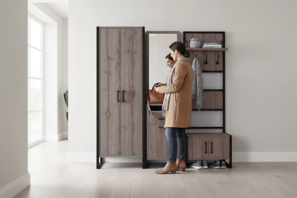 Модульна конструкція дозволяє розмістити всі необхідні речі: верхній одяг, взуття, аксесуари та дрібниці, які завжди мають бути під рукою.