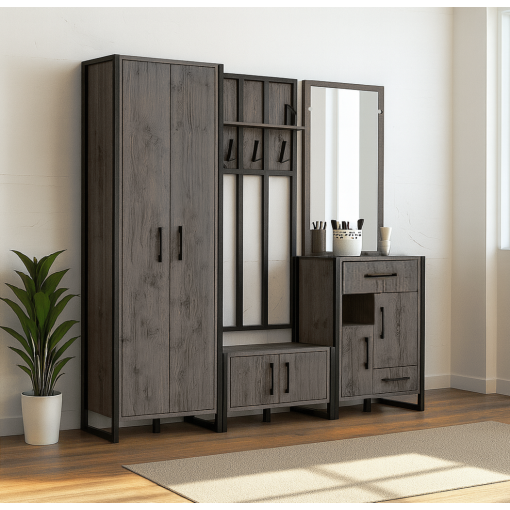 Передпокій у стилі лофт — це сучасний комплект меблів, створений для зручного та стильного облаштування Вашого коридору. Поєднання теплої деревної текстури та чорного металевого каркаса робить такий передпокій виразним акцентом інтер’єру, а продумана функціональність забезпечує комфорт у щоденному користуванні.