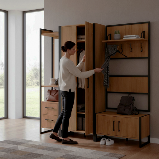 Модульна конструкція дозволяє розмістити всі необхідні речі: верхній одяг, взуття, аксесуари та дрібниці, які завжди мають бути під рукою.