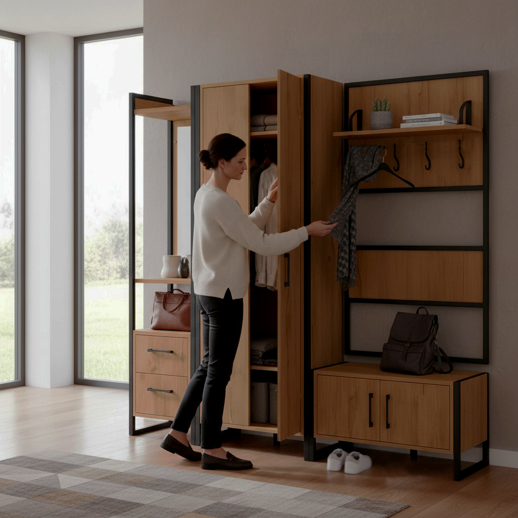 Передпокій у стилі лофт — це сучасний комплект меблів, створений для зручного та стильного облаштування Вашого коридору. Поєднання теплої деревної текстури та чорного металевого каркаса робить такий передпокій виразним акцентом інтер’єру, а продумана функціональність забезпечує комфорт у щоденному користуванні.