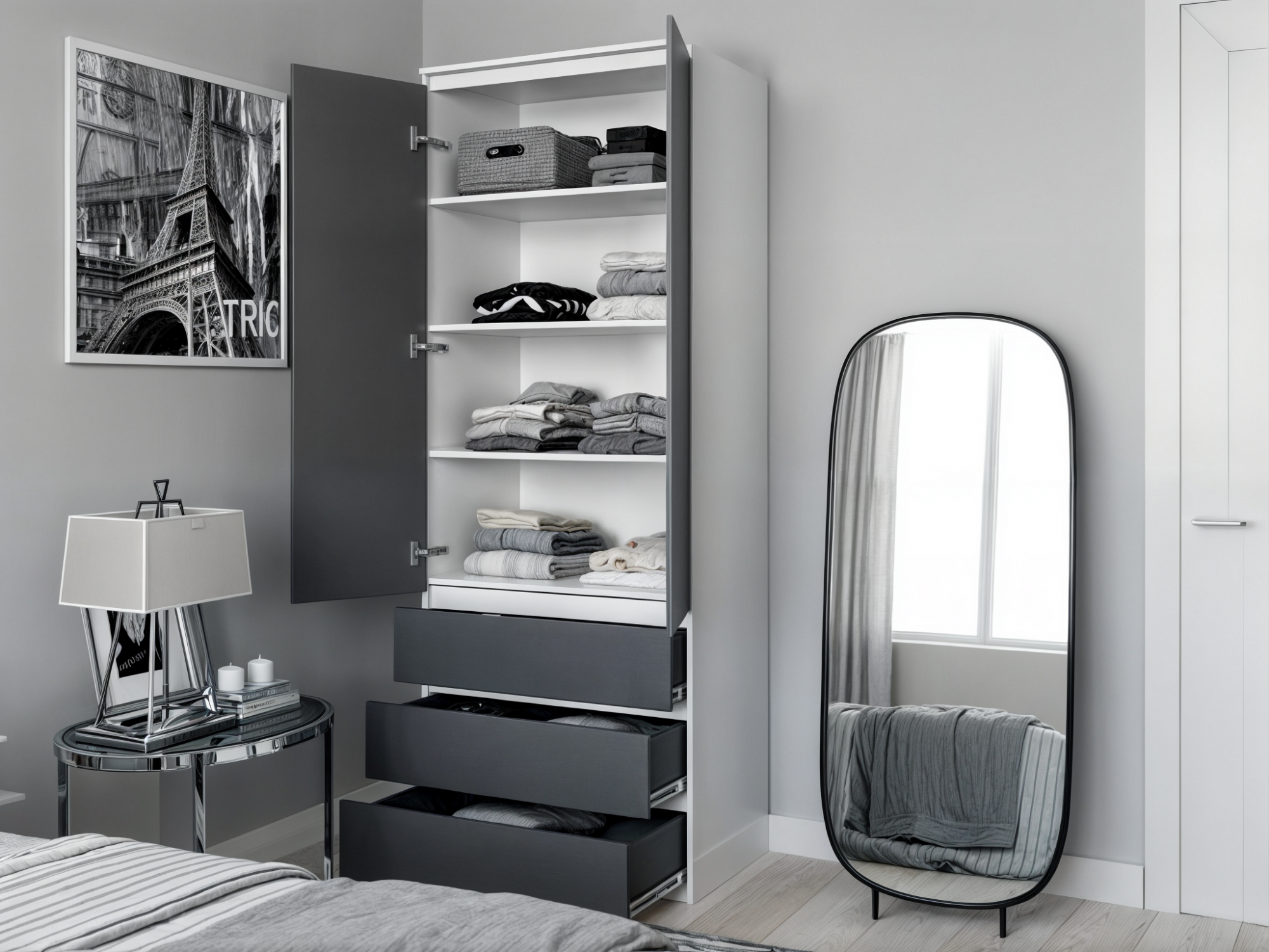 Шукаєте рішення для зберігання речей, яке не обтяжить Ваш інтер'єр? Наша шафа для одягу з розпашними дверцятами – це ідеальний вибір для тих, хто цінує лаконічний дизайн та функціональність.