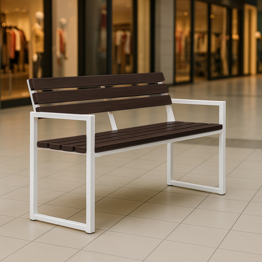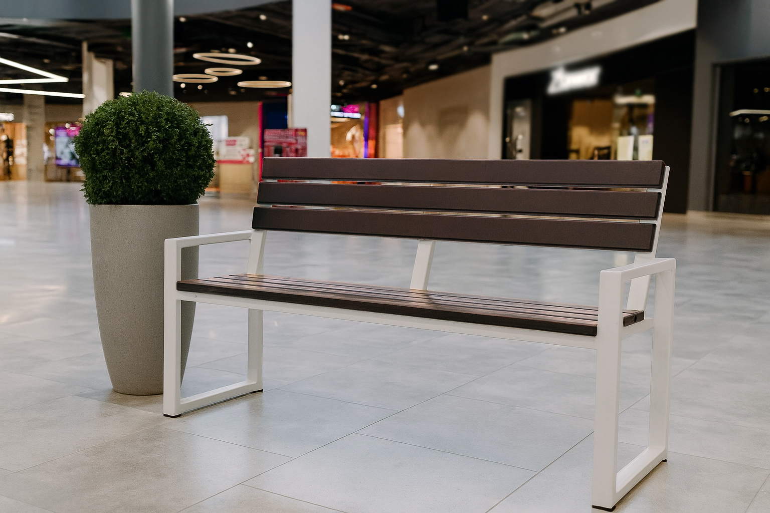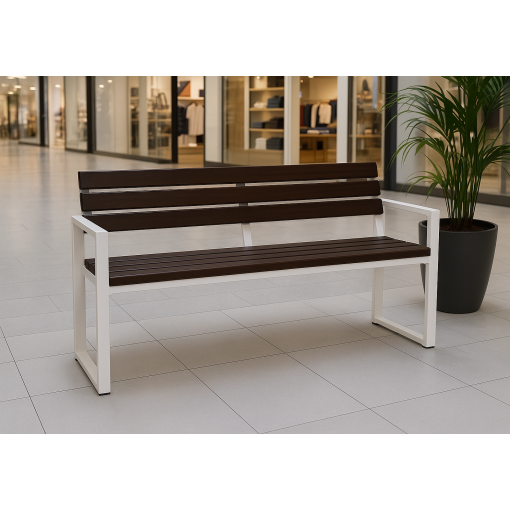 Лавка «Модерн Люкс» зі спинкою та підлокітниками - ідеальна для саду, дачі чи громадського простору. Сидіння і спинка з високоякісного ПВХ стійкі до сонця, вологи та не потребують догляду. Металевий каркас гарантує міцність і довговічність, порошкове фарбування захищає від корозії.