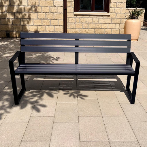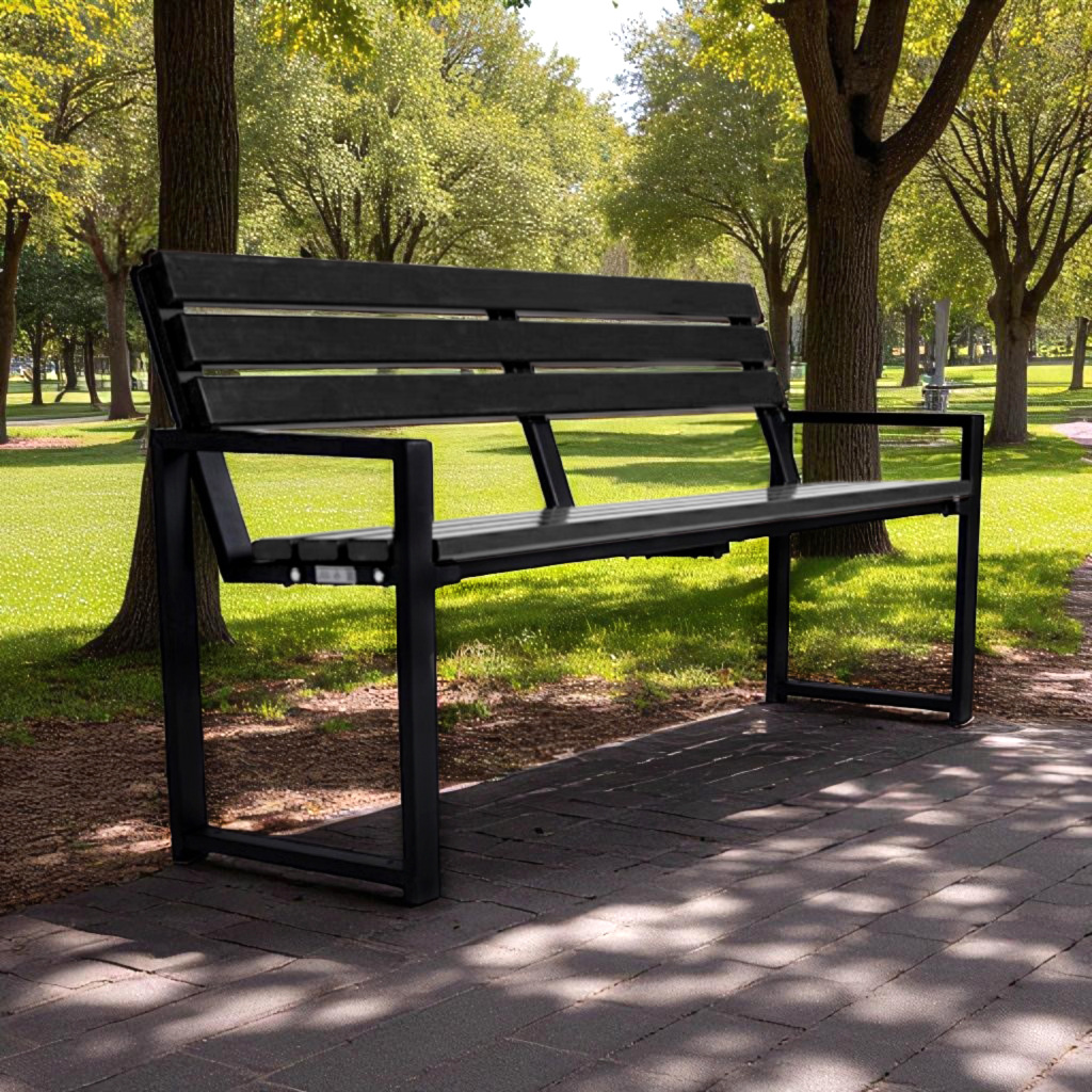 Лавка «Модерн Люкс» зі спинкою та підлокітниками - ідеальна для саду, дачі чи громадського простору. Сидіння і спинка з високоякісного ПВХ стійкі до сонця, вологи та не потребують догляду. Металевий каркас гарантує міцність і довговічність, порошкове фарбування захищає від корозії.