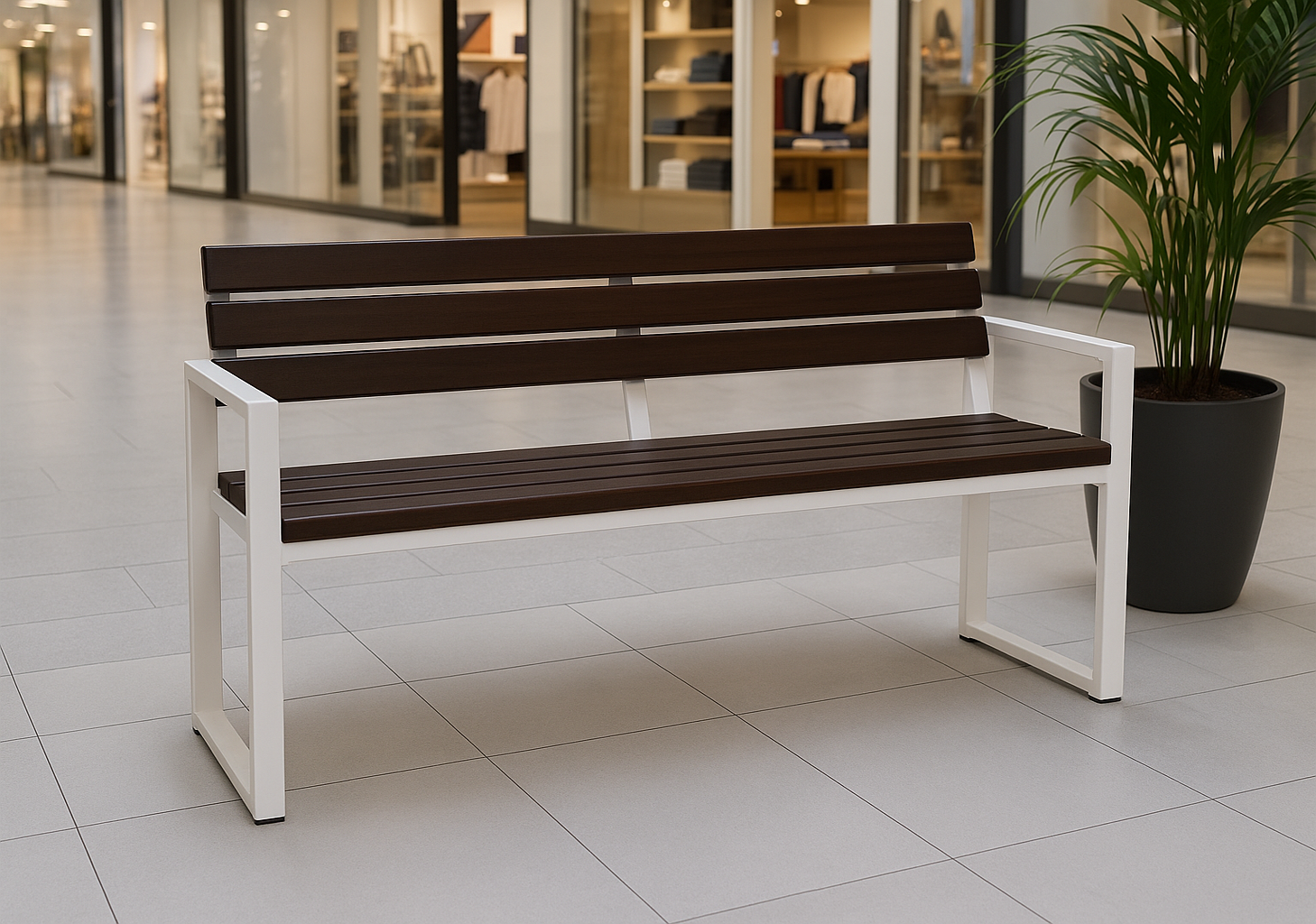 Лавка «Модерн Люкс» зі спинкою та підлокітниками - ідеальна для саду, дачі чи громадського простору. Сидіння і спинка з високоякісного ПВХ стійкі до сонця, вологи та не потребують догляду. Металевий каркас гарантує міцність і довговічність, порошкове фарбування захищає від корозії.