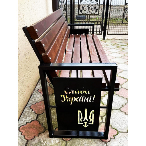 Стильний дизайн: привертають увагу опори лавки, декоровані гербом. Ця витончена деталь робить виріб справжнім витвором мистецтва, який стане стильним акцентом будь-якого саду, тераси, паркової зони або прибудинкової території.
