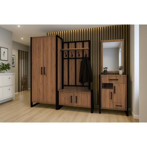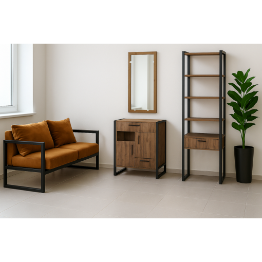 Функціональна конструкція дозволяє зручно зберігати речі та аксесуари, підтримуючи порядок у щоденному користуванні. Тумба для передпокою у стилі лофт підходить як для невеликих, так і для просторих коридорів та легко поєднується з іншими меблями для передпокою.