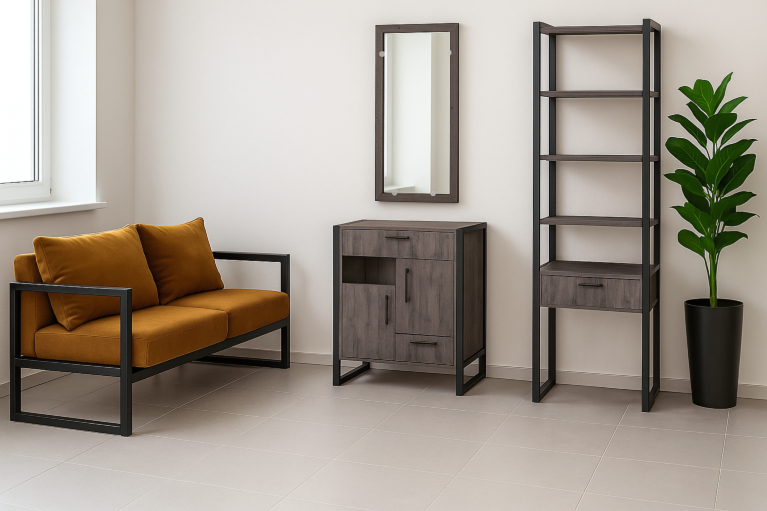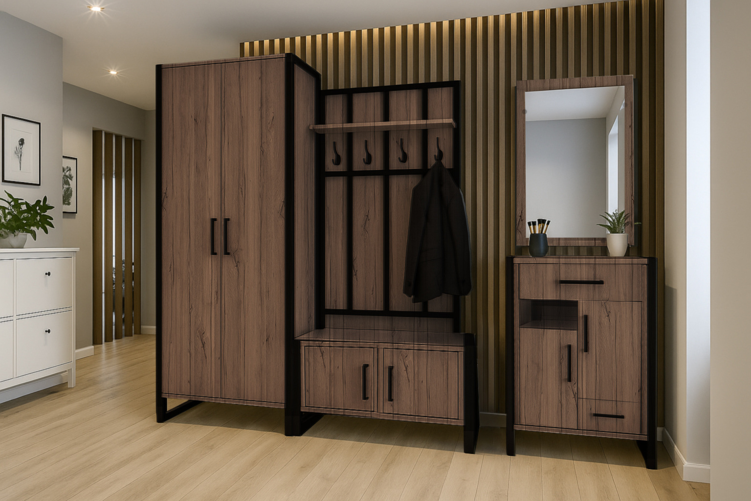 Тумби для передпокою у стилі лофт — це практичне та стильне рішення для облаштування коридору в квартирі, будинку чи офісі. Поєднання ЛДСП з натуральною деревною текстурою та чорного металевого каркаса створює сучасний індустріальний вигляд і робить тумбу в передпокій виразним елементом інтер’єру.