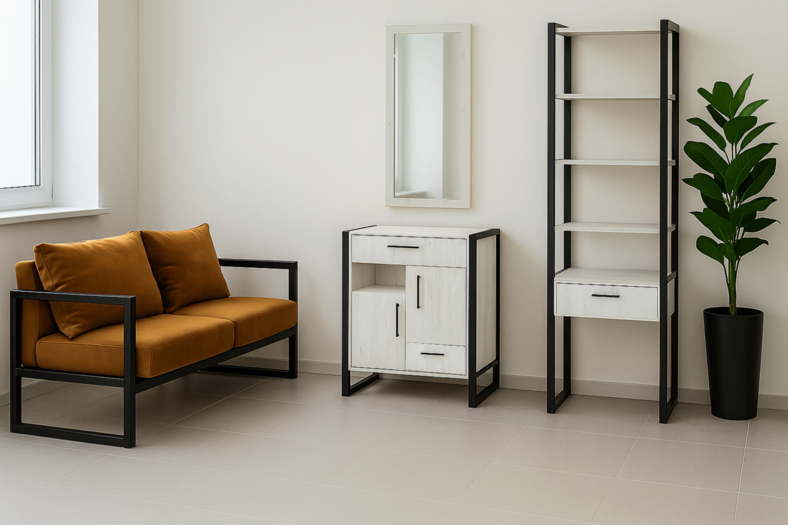 Тумбы для прихожей в стиле лофт — это практичное и стильное решение для обустройства коридора в квартире, доме или офисе. Сочетание ЛДСП с натуральной древесной текстурой и черного металлического каркаса создает современный индустриальный вид и делает тумбу в прихожую выразительным элементом интерьера.