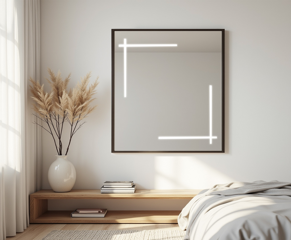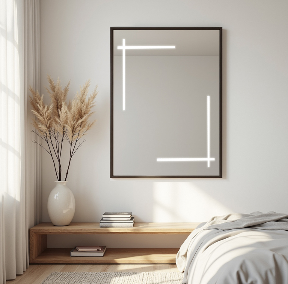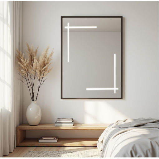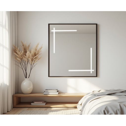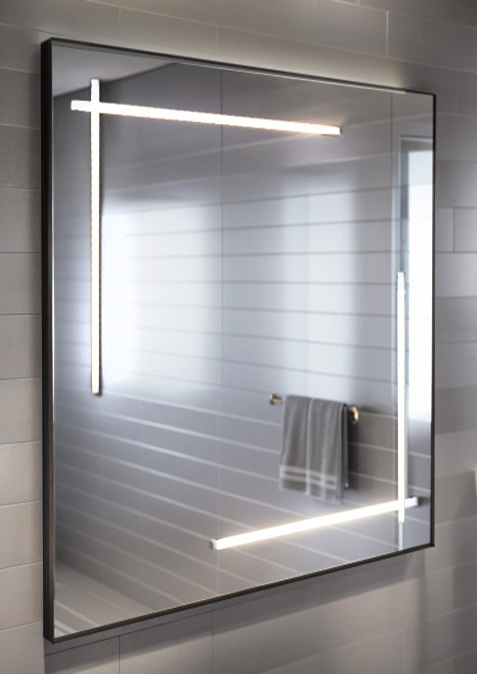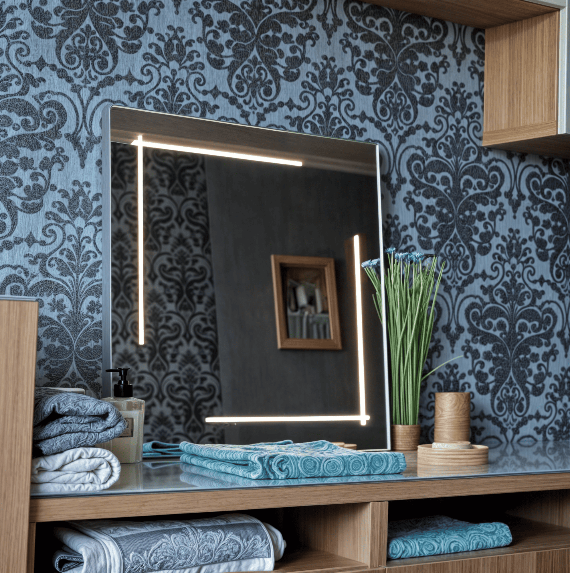 Дзеркало: високоякісне скло виробництва AGC Belgium гарантує чітке та яскраве відображення. Дзеркальне полотно має ступінь захисту IP44, що дозволяє використовувати виріб у ванних кімнатах.
